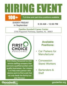 Looking for work in the Opelika area? First Choice Personnel is partnering with Goodwill Southern Rivers to connect qualified workers with great businesses!